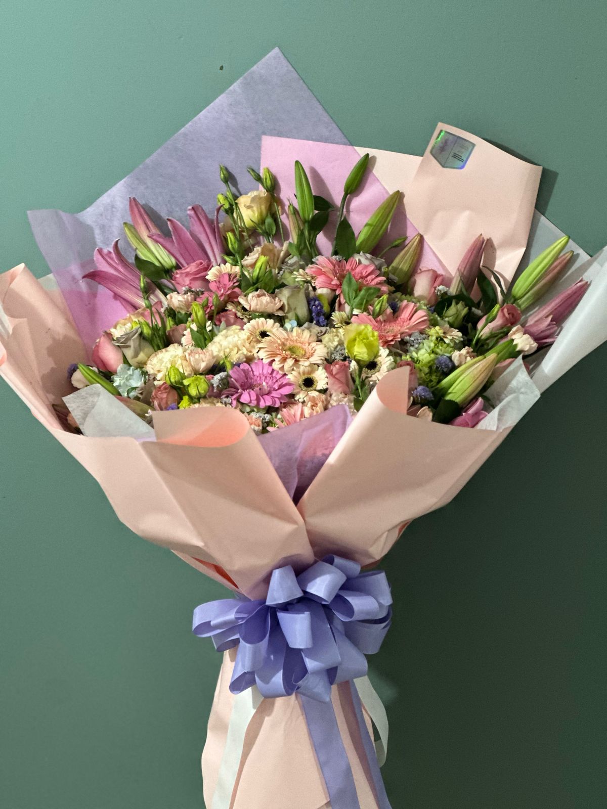 Perfecta combinación de mix de colores pasteles finos en su composición y follajes importados